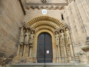 Eindrucksvoll erhebt sich der romanische Dom mit seinen vier Kirchtürmen auf dem Domberg über der Stadt. Trotz Corona dürfen wir das Gebäude durch die Adamspforte betreten. Über dem Rundbogenportal prangt das Wappen des Papstes, dass das Gebäude als Basilika Minor ausweist. Zur Linken stehen der heilige Stephanus, Kaiserin Kunigunde sowie der Bistumsgründe Heinrich II. Die Figuren rechts der Tür zeigen Petrus, Adam und Eva.