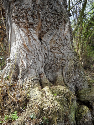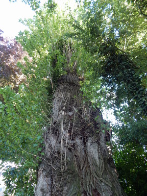 Mein Liebling ist eine Schwarzpappel in der Nähe des ehemaligen Tennisplatzes. Sie hat einen sagenhaften Umfang von 7,30 m! Ich liebe diesen Baum seit meiner Kindheit. Längst haben seine dicken Wurzeln den Asphalt aufgebrochen. Der untere Stamm ist ganz knorrig. Er zeigt, dass der Baum recht alt ist. Im Herbst wachsen Pilze darauf. Vor ein paar Jahren wurde meine geliebte Schwarzpappel in mittlerer Höhe komplett durchgesägt. Ich konnte es nicht fassen und dachte, der Baum würde jetzt sterben. Doch er lebt nicht nur weiter, er treibt in alle Richtungen aus.