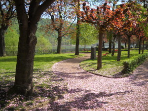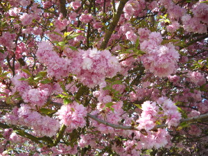 Der Japanische Nelkenbaum ist voll mit dichten rosa Blüten. Wenn der Wind geht wirken die Wege wie gepudert.