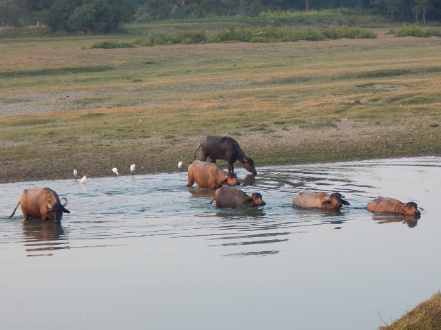 Am Fluss weiden einige dunkle Wasserbüffel, die wohl zum Dorf der Tharu gehören. Wie auf Kommando schwimmt die ganze Herde plötzlich durch den Fluss, um an uns vorbei zum Dorf zu traben. Was für ein schöner Anblick!