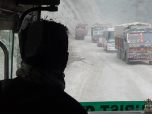 Die Straße schlängelt sich in einem Tal zwischen hohen Bergen mit dramatischen Ausblicken. Wir sind nicht allein, mit uns reisen jede Menge Busse und Lkws, die waghalsige Überholmanöver wagen. Große Teile der Fernstraße werden gerade neu gebaut, sodass lange Staus entstehen. Der Staub hüllt alle Fahrzeuge ein.