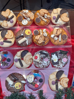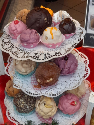 Die örtlichen Bäckereien und Cafés locken uns mit leckerem Weihnachtsgebäck, Kuchen und Teilchen in allen Farben und Formen. In Rothenburg ob der Tauber sollen die Schneeballen erfunden worden sein, die hier so bunt zum Anbeißen auf einer Etagere liegen. Aber auch die Muffins sind zauberhaft oder?