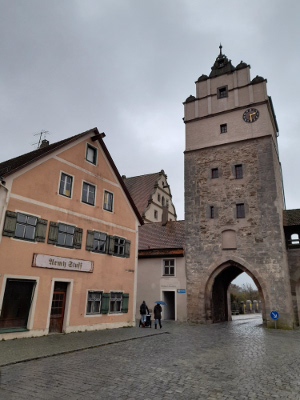 Wir sind auf einer Winterreise zu mehreren Weihnachtsmärkten unterwegs. Unser Bus bringt uns zum Parkplatz P1 auf der Schwedenwiese, von hier aus können wir den ganzen Tag die schöne Altstadt von Dinkelsbühl erkunden. Es ist nur eine kurze Wegstrecke am Dreigangsturm vorbei bis zum Wörnitztor, einem von vier Stadttoren von Dinkelsbühl.