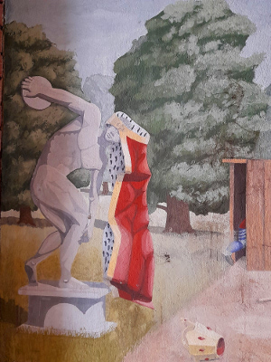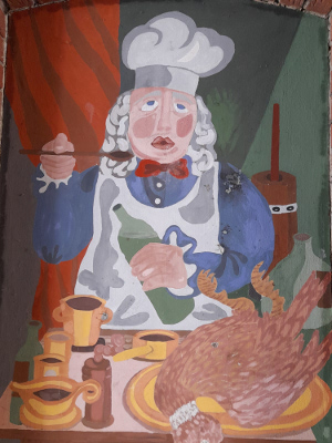 Hinter dem Römischen Kaiser stoßen wir auf eine offene Galerie, die den dunklen Durchgang erheblich verschönert. Schüler der Goetheschule in Wetzlar haben die Bilder zu Ehren des unbekannten Bildhauers des römischen Kaisers im Jahr 1980 gestaltet.