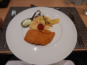 Jedem Passagier wird im Vorfeld ein fester Platz für die Mahlzeiten im Restaurant zugewiesen. Das Sicherheitskonzept plant genügend große Abstände ein. So sitzen wir an einem schönen Zweiertisch am Fenster. Alle Mahlzeiten finden in einer Sitzung statt. Die Gerichte wählen wir aus der Speisekarte aus. Es gibt mehrere Gänge, die an den Tisch gebracht werden. Das Frühstücksbuffet mit Selbstbedienung fällt aus. Aufgrund der Coronabestimmungen sind weniger Passagiere an Bord, sodass genügend Platz vorhanden ist.