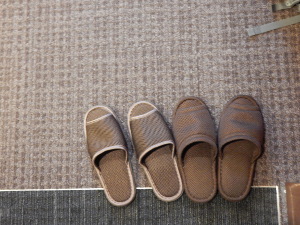 Am Abend werden wir im Hotel Noborisaka, einem 2-Sternehotel, einquartiert. Wir hatten ein einfaches Zimmer im Nebengebäude ohne Blick auf den Fuji. Die Hausschuhe standen bereit oder waren es die Schlappen für das Bad? Immerhin gibt es einen hauseigenen japanischen Onsen, das warme Thermalbad zum Entspannen.
