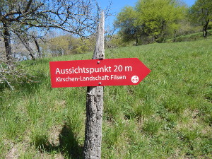 Wir wandern jedoch zurück zum Kirschenpfad. Nach einer Klettertour hinab führt der Weg nach rechts über ebene Wiesen. Wir kommen an der Grillhütte am Hexengraben und den Bastardkirschbäumen vorbei. Eine runde Infosäule wirbt für den Kirschenpfad und die Produkte aus heimischen Kirschen. Ein knalligrotes Symbol ist die Kirschenbank Filsen in Form einer reifen Doppelkirsche, wenn das kein Fotomotiv ist, weiß ich es auch nicht mehr.