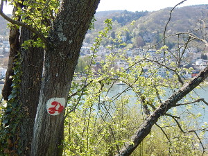 Der Weg am Rande der Klippen wird steiler und felsiger und wir kommen gehörig ins Schwitzen. Belohnt werden wir durch die vielen Aussichten auf den Rhein. Mein Heimatstädtchen Boppard blitzt immer wieder vorwitzig zwischen den Bäumen hindurch. Dann ist die Alte Burg zu erkennen oder die ganze Rheinfront mit den Rheinanlagen und der Severuskirche.