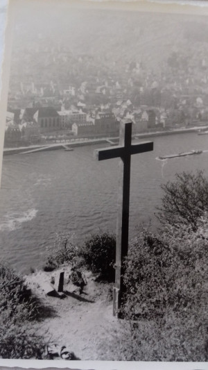 Ich erinnere mich, dass mein Vater erzählt hat, wie er das Bopparder Kreuz mit seinen Kollegen der Stadt Boppard auf dem Bergrücken Filsener Ley neu errichtet hat. Eine mühsame und schweißtreibende Angelegenheit, die ihn mit Stolz erfüllt hat. Jetzt bin ich so weit hinaufgeklettert, die paar Meter gehe ich weiter. Das große Holzkreuz ist von Boppard aus sichtbar. Das erste Kreuz wurde im Juni 1904 vom Bopparder Apotheker Francke auf eigene Kosten errichtet. (Quelle: VVV Boppard)