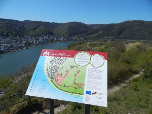 Ein großes rotes Schild weist auf einen Aussichtspunkt in 20 Meter Entfernung hin. Das wollen wir uns nicht entgehen lassen. Nach der Ruhepause steigen wir erfrischt weiter den steinigen Weg hinauf, der jetzt auch zum Rheinsteig gehört. Der nächste Aussichtspunkt besteht aus einer kleinen Terrasse mit einer Mauer zum Sitzen. Wenn wir uns umdrehen, können wir gut die Kirschenlandschaft erkennen, die von der größten Rheinschleife umrahmt wird.