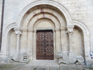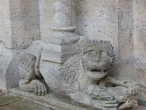 Am Eingangstor begrüßen uns zwei Löwen, die das Portal bewachen. Der linke Löwe hindert den Ungläubigen am Eintreten, indem er ihn vorher packt. Während der rechte Löwe seine frommen Schäfchen bewacht (Quelle: Otto Krugel, Kaiserdom Königslutter). Das Tor lässt italienische Einflüsse erkennen. Die beiden Löwen lassen uns brav hineingehen.