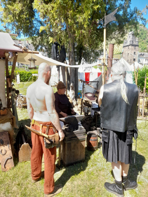 Der Schmied zeigt seine Schiedekünste während er mit kräftigen Recken parliert. Wir dürfen selbstgemachte feurige Drachenliköre probieren. Es werden Met, Honig und Honigwein, Wurst und Käse angeboten.