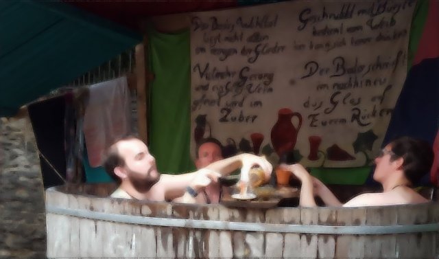 Im Badehaus haben es sich ein paar Herren der Schöpfung so richtig gemütlich gemacht. In einem großen hölzernen Waschbottich laben sie sich bei Speis und Trank. Davon kann das arme Volk im Sackleinen auf der Straße nur träumen!