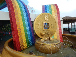 Ein bunter Brunnen zum Münzenwerfen und ein goldener Thron aus Hufeisen spricht als Fotomotiv sicher mehr die asiatischen Besucher an.