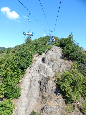 Wanderer klettern die Ripp hinauf. Dabei handelt es sich um einen steilen Felsen des Rheinischen Schiefergebirges, in dem an den schwierigsten Stellen Stufen zu erkennen sind. Als Kind war mir bei der Überwindung der Stützen der Seilbahn etwas mulmig, da es ein bisschen ruckelte. Heute ist davon nichts mehr zu spüren.