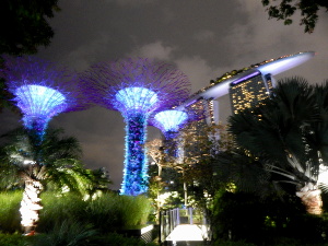 Magisch wirken die Supertrees, 12 künstliche Bäume, die zwischen 25 und 50 Meter hoch sind. Sie dienen nicht nur der Aufzucht von Pflanzen, sie erzeugen auch Strom, sammeln Wasser und dienen als Kühlsystem. Eine Hängebrücke, der OCBC Skywalk, führt in luftiger Höhe zwischen den Supertrees hindurch.