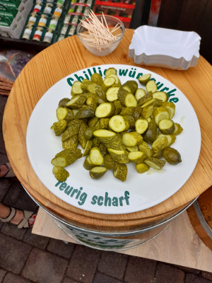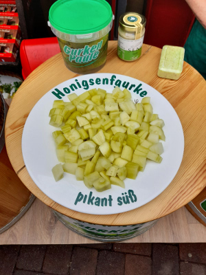 Der Verkaufsstand hält noch weitere Geschmäcker bereit. Wie wäre es mit Salzgurke, Pfeffergewürzgurke, Knoblauchgewürzgurke, Currygewürzgurke oder Meerrettichsenfgurke. Nur zu! Lass es dir schmecken. Was ist dein Liebling? Mir hat die Honigsenfgurke besonders gut geschmeckt.