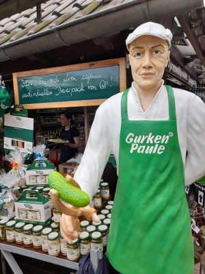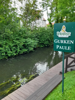 Kurz danach finden wir den berühmten Gurken Paule, der ein Spreewälder Original sein soll und hier mit einem Stand vertreten ist. Seit den neunziger Jahren verkauft er hier leckere Gurken, verschiedene Spreewald Souvenirs und andere Produkte. Einen gemütlichen Biergarten mit Blick auf die Spree gibt es auch. Dort gibt es herzhafte Gerichte von Backfisch bis Spreewald Sülze. Süßmäulchen können Eis, Apfelstrudel, Milchreis und Hefeplinse probieren.
