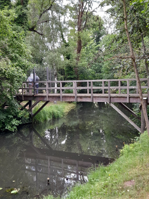 Am Schloss gehen wir vorbei und überqueren anschließend eine Holzbrücke über das Fließ (Bach), um auf die Schlossinsel zu gelangen. Der schattige Park bietet neben einem Wasserspielplatz, einen Sandstrand und viel Platz für Erholung und Muße.