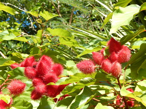 Im Garten fällt mir ein Baum mit roten Früchten auf. Unser Reiseleiter pflückt ein Exemplar, um uns später im Bus seine Wirkung zu zeigen. Der Lippenstiftbaum (Lipstick Tree, Annatto oder Bixa orellana) ist vielseitig nutzbar. Die roten Kapselfrüchte färben sehr stark. Sie wurden früher zum Schminken verwendet. Mit dem roten Farbstoff färben die indigenen Völker in Südamerika Haut und Haare.