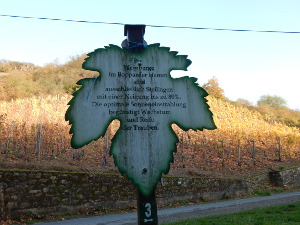 So lerne ich, dass der Weinberg neben mir die Methode des Trierer Rad zur Reberziehung verwendet. Klar zu erkennen ist ein Rad in ca. 1,5 Meter Höhe. Da Reben ranken, benötigt die Pflanze eine Unterstützung in Form eines Holzpfahls oder ähnlichem, an dem sie sich festhalten kann. Das Trierer Rad wurde von Paul Slamka aus Trier speziell für den Steillagenanbau entwickelt.